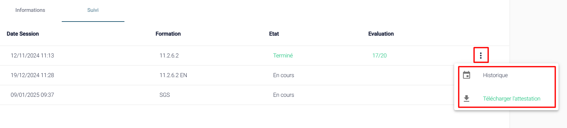 3) En cliquant sur les trois points à droite, vous avez la possibilité de voir l'historique d'une formation dès que l'état d'avancement est "en cours" et de télécharger son attestation quand l'état est "Terminé".